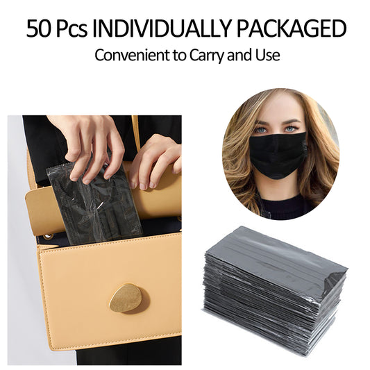 Pack of 50 Disposable Face Mask 3-Ply Breathable & Comfortable Safety Mask, Protective Masks for Indoor and Outdoor - Individually Wrapped (Black Mask)